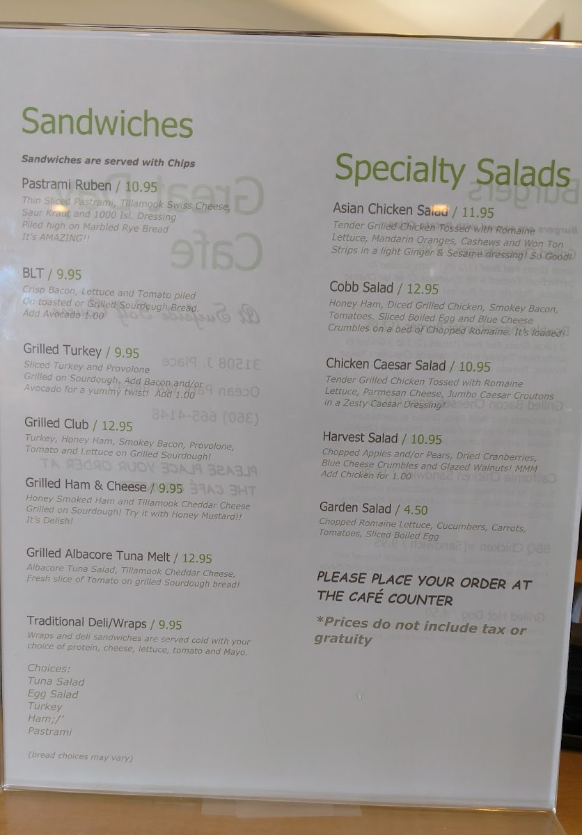 Welcome to Great Day Cafe, a hidden gem located in Ocean Park, WA. This charming cafe delights guests with a menu that celebrates fresh, quality ingredients. Highlighted offerings include a variety of mouthwatering sandwiches, such as the decadent Pastrami Ruben and the beloved Grilled Turkey. For salad lovers, the Asian Chicken Salad and Cobb Salad are standouts, ensuring a satisfying meal for every palate.